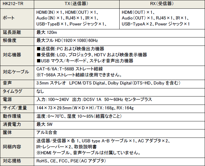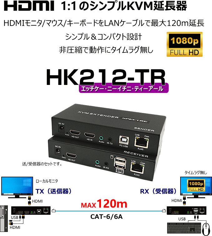 HDMI KVM LANケーブル延長器 HK212-TR 最大120m