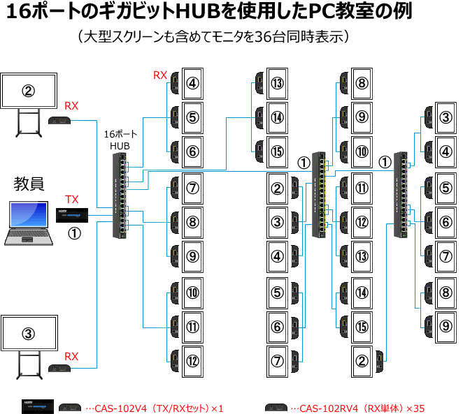 例えば、以下のようにPC教室を構築することができます。