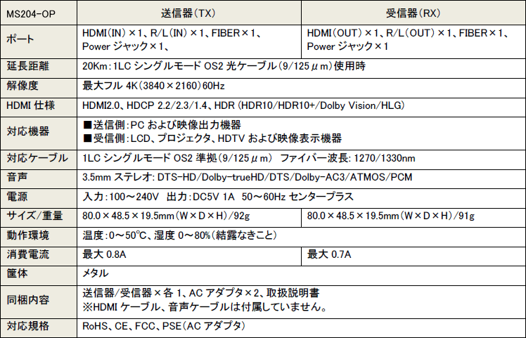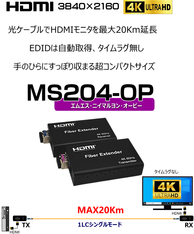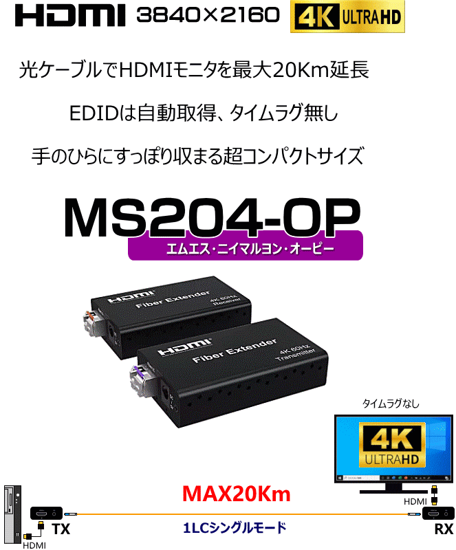 MS204-OPはHDMIモニタ&音声を、1本の光ケーブルで延長する延長器です。