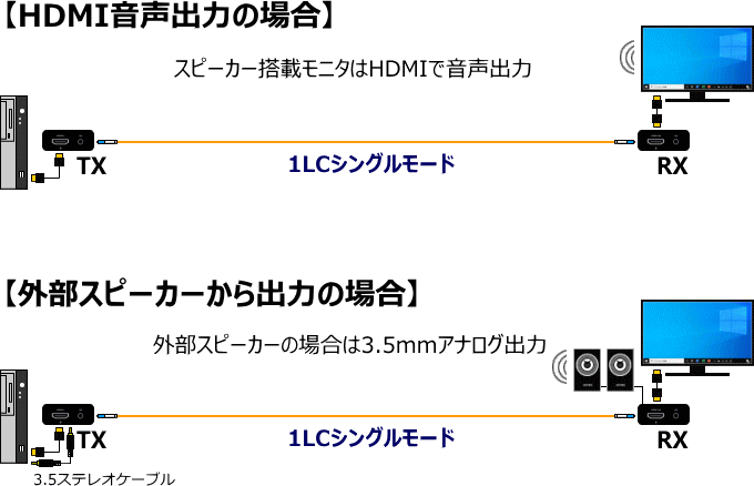 MS204-OPはHDMIの音声を延長できます。スピーカー内蔵のモニタの場合は、モニタから音声を出力します。